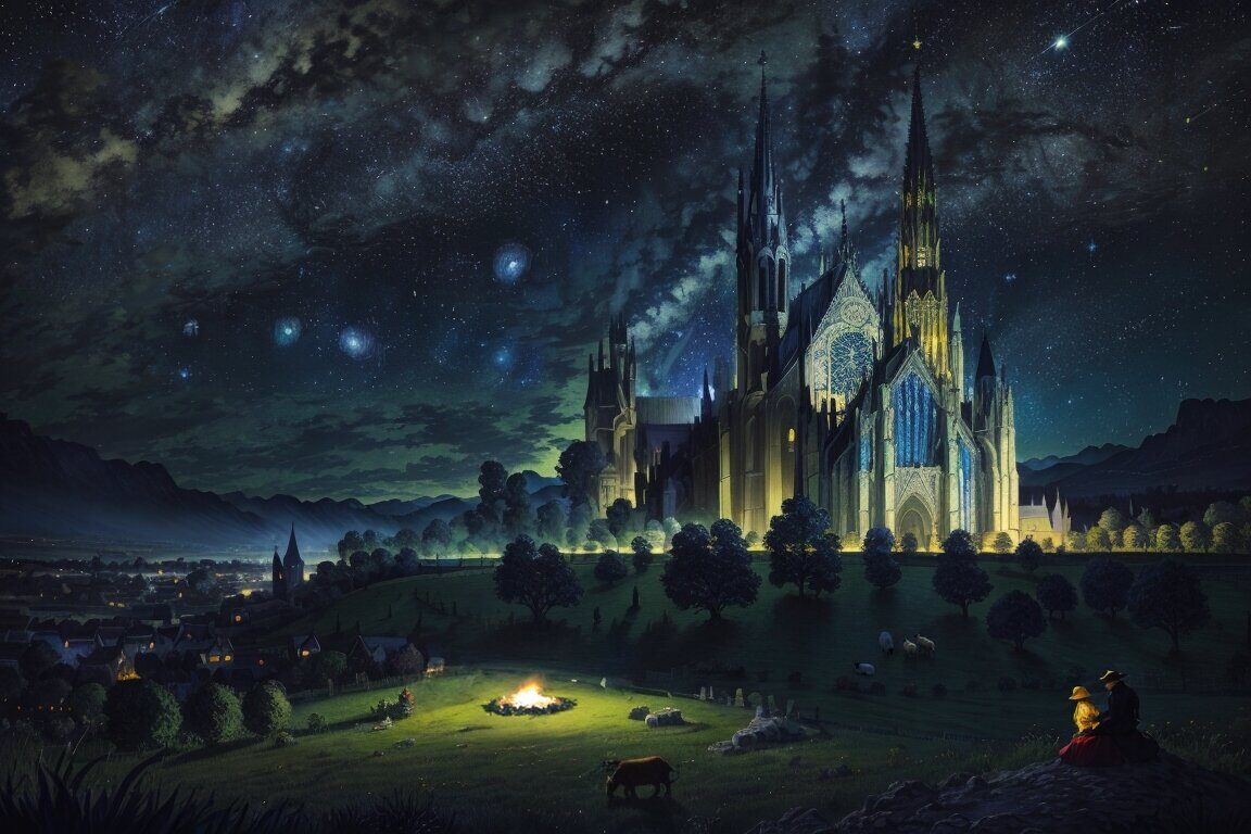 И ещё одна тематическая подборка картин, созданных нейросетью, на сей раз в жанре научной фантастики, фэнтези и мистики. Осколки цивилизации. Прибытие - 2 Впервые идея картины в жанре постапокалипсиса «Осколки цивилизации. Прибытие» появилась у меня несколько лет назад. По сюжету девушка с Земли высаживается на далекой планете и исследует руины погибшей цивилизации. Для портрета космической исследовательницы я попросил попозировать коллегу по работе, а для постапокалиптического пейзажа сфотографировал один заброшенный на тот момент объект в Барнауле и изменил его до неузнаваемости в Фотошопе. Спустя годы я решил создать второй вариант картины, используя новые возможности, которые появились благодаря нейросетям. Подробно описав Leonardo AI сюжет и внешность персонажа, я дополнительно предоставил нейросети портрет гостьи с Земли с первой картины и дал задание взять его за основу при создании нового рисунка. Результат очень порадовал. Нейросеть не только нарисовала впечатляющий постапокалиптический пейзаж, но и точно изобразила портрет исследовательницы с первой картины, при этом перерисовала его в совершенно другом стиле, с иным освещением, с другой позой и поворотом головы, в точности вписав в новую окружающую обстановку. Со временем мы на пару с нейросетью создали целую серию картин из серии «Осколки цивилизации. Прибытие», с разными персонажами, не все из которых люди, в разных художественных стилях, но объединенных общей темой – высадки на другую планету для исследования руин погибшей цивилизации. И снова исследовательница идет навстречу неизведанному через полуразрушенный портал. На сей раз исследователем погибшего мира, затерянного на просторах космоса, выступил робот. Инопланетный грызун Симпатичный инопланетный зверёк с сочным фруктом. Разноцветная корова Недалекое будущее. Красивая разноцветная генномодифицированная корова пасется на альпийском лугу на фоне футуристических домиков для туристов. Космическая путешественница Что будет если попросить нейросеть изобразить девушку-космическую путешественницу за штурвалом звездного корабля в стиле студии Ghibli? Получилась вот такая задорная, любопытная, смелая девушка, отправляющаяся в космос навстречу приключениям. И характер, и внешность – всё в духе знаменитой студии аниме. Наверное, даже сам Хаяо Миядзаки мог бы принять её за кого-то из своих персонажей. Продолжение темы космической путешественницы в стиле студии Ghibli. Дверь в лето Пожалуй, зимой многие хотели бы отыскать такую «Дверь в лето» и сбежать подальше от холода в тёплые края. Источником вдохновения для картины послужил одноимённый фантастический роман Роберта Хайнлайна, а также серия романов Стивена Кинга «Тёмная башня». Нейросеть нарисовала картину со стилизацией под творчество художника Майкла Уэлана, специализирующегося на оформлении научно-фантастических и фэнтезийных книг.